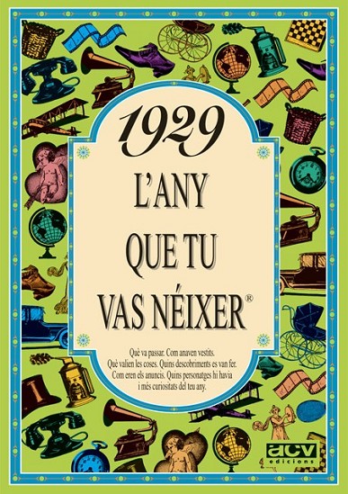 El llibre de 1929 conté una selecció de notícies curioses que van passar aquell any, imatges, anuncis i en general tot allò per entendre com era el món aquell any, com era la moda, què es va inventar, quins anuncis hi havia, les cançons i les pel·lícules d'èxit, quant valien les coses, quins personatges famosos destacaven, i moltes coses més. Aquest llibre de 1929 forma part de la popular col·lecció "L'any que tu vas néixer". Un detall ideal per al protagonista de la festa d'aniversari, o per sorprendre a cadascun dels convidats del teu proper sopar amb amics o família. Posa el llibre de l'any de cada convidat al seu lloc de la taula i veuràs la sorpresa quan se'l trobin. De seguida es trencarà el gel amb converses apassionades plenes de records. La col·lecció "L'any que tu vas néixer" va de 1920 a 2003.