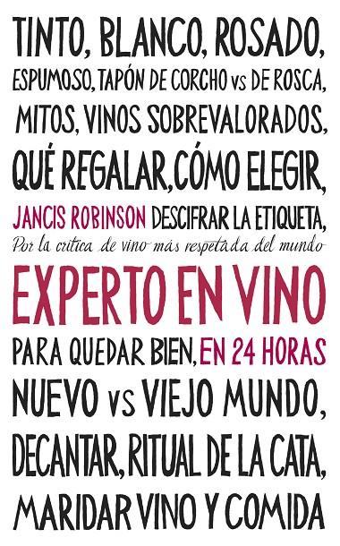 En El experto en vinos en 24 horas, Jancis Robinson comparte toda su experiencia con ingenio y accesibilidad para todos los públicos. Desde la diferencia entre un vino tinto y un vino blanco, hasta saber valorar la forma de las botellas y entender sus etiquetas, pasando por las descripciones básicas de sabor, color y olor, cómo armonizar cada vino con una comida o saber valorar correctamente la relación calidad-precio de un vino...